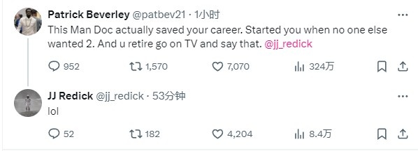 贝弗利看不过眼发推喷道:“这个男人,里弗斯实际上拯救了你的职业生涯,当没人想要你的时候,他让你打首发。现在你退役了,去电视上说这些?@雷迪克”