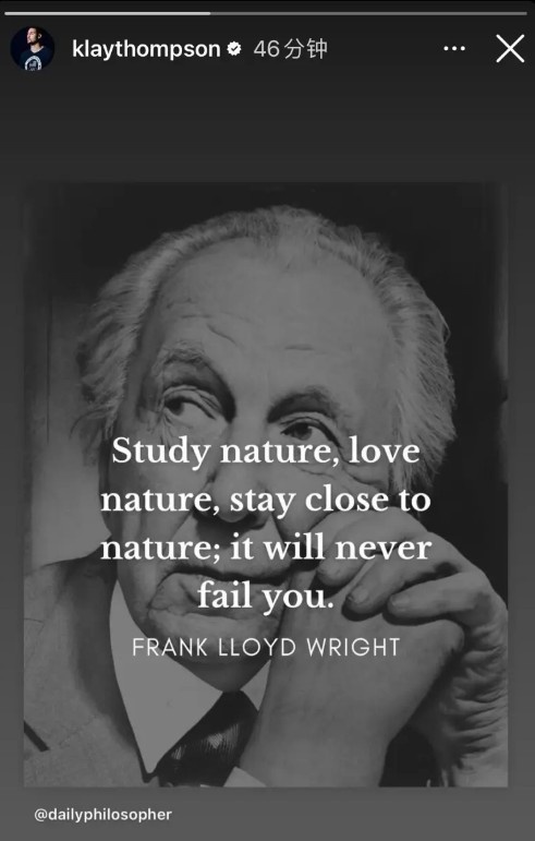 2月22日讯 勇士球星克莱-汤普森今日更新个人INS,并转发了美国知名建筑师弗兰克-劳埃德-赖特的名言。克莱转发道:“研究自然,热爱自然,亲近自然,它永远不会让你