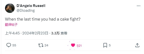 2月23日讯 今日是湖人球星拉塞尔的27岁生日,拉塞尔在社媒发问:“你们上次打蛋糕大战是什么时候?”