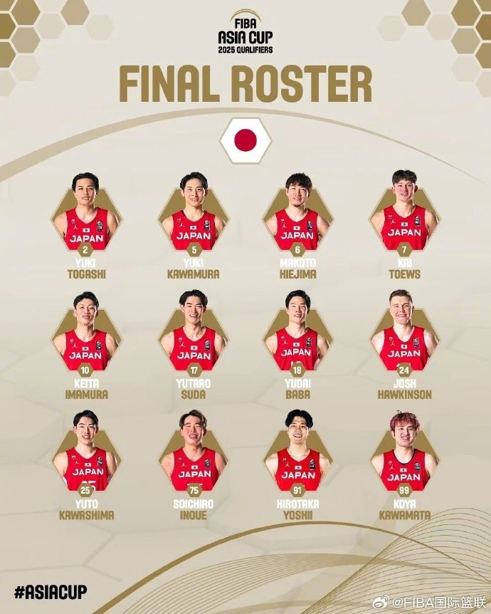 2月25日讯 今天,日本男篮公布了亚预赛中日对决的12人名单,河村勇辉、比江岛慎、霍金斯在列。
