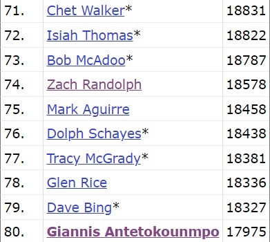 此役,雄鹿球星字母哥17中10拿下30分12板9助,其生涯常规赛总得分突破18000分大关,来到18005分,暂列NBA历史第80位。