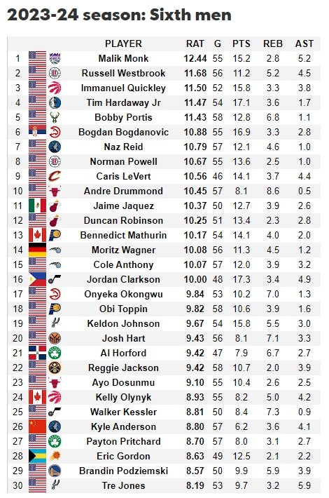 Hoopshype预测本赛季最佳第六人归属:蒙克居首 威少第二!