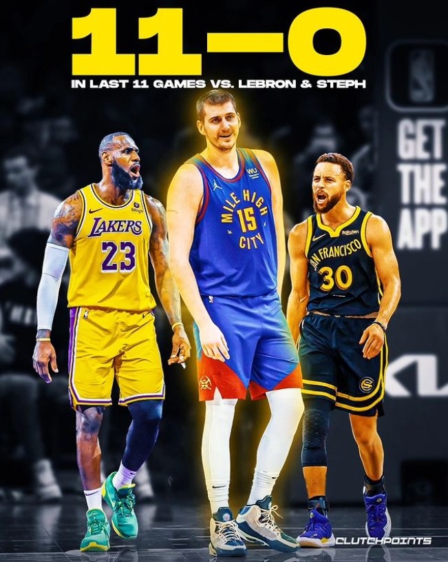 约基奇过去11场面对詹姆斯和库里战绩为11胜0负。