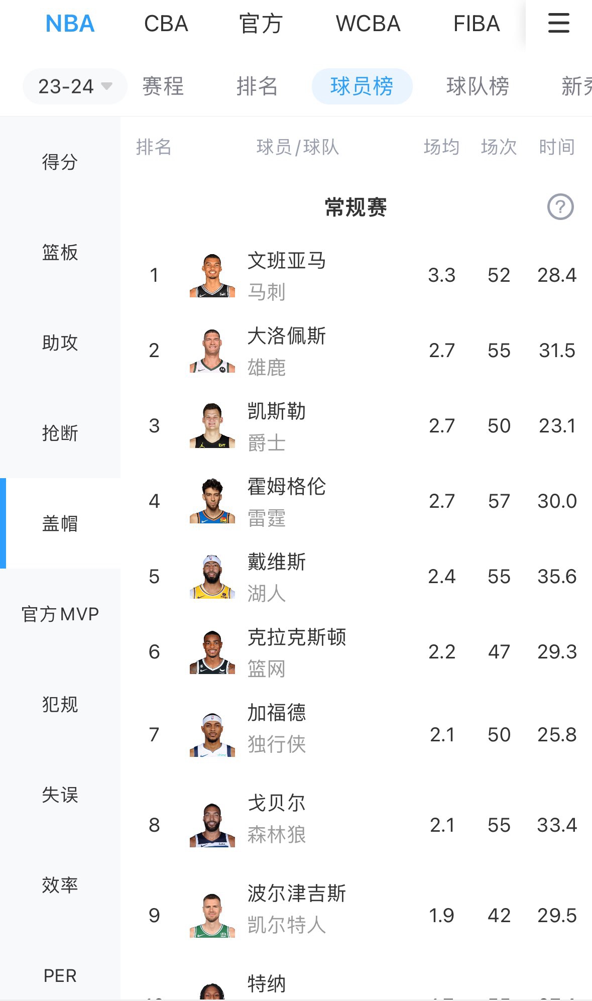 文班亚马本赛季至今出战52场比赛,场均可以贡献1.3次抢断和3.3次封盖。