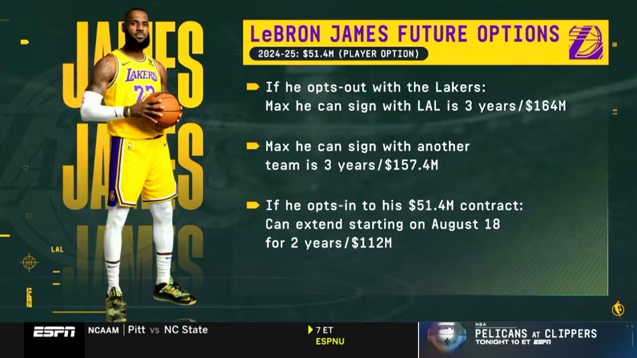 2月29日讯 本赛季结束后,詹姆斯拥有2024-25赛季5140万美元的球员选项,届时他可能做出以下三种选择: