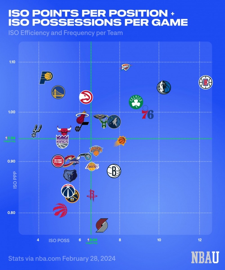 横轴代表场均单打次数、纵轴代表每次单打得分联盟各队平均:场均6.64次单打、平均每次得0.94分相关新闻>>>每次单打得分前十:小卡1.21分第1 库里&哈登第4 东