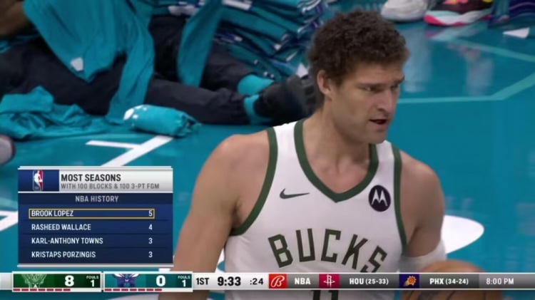 3月1日讯 NBA常规赛,雄鹿对阵黄蜂。本场比赛前,雄鹿中锋大洛佩斯已送出153记盖帽并命中99个三分,他在首节投进三分后,转播方晒出一项数据,NBA历史多个赛季达成