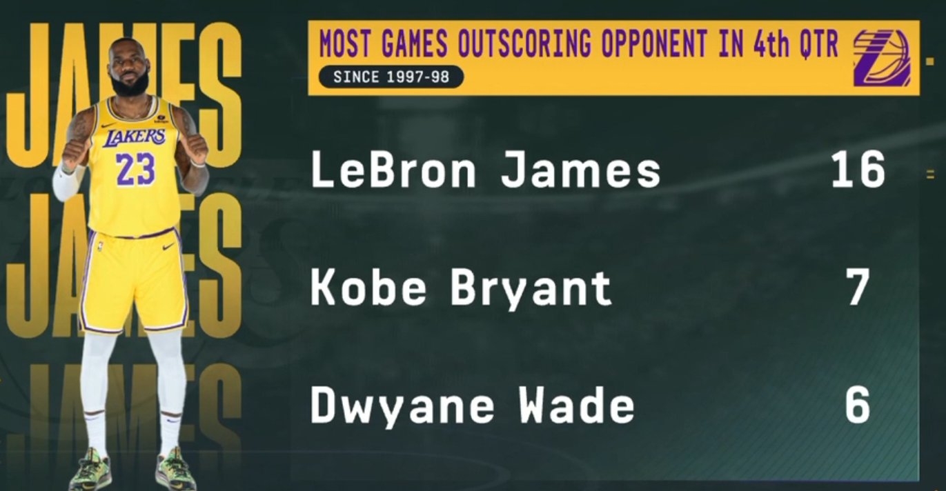 末节得分超对手全队:詹姆斯16次历史断层第一 科比7 韦德6