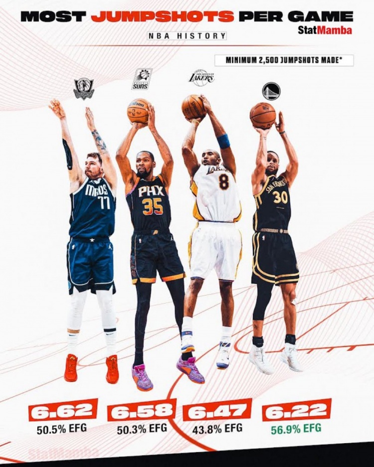 NBA历史场均跳投得分王:东契奇6.62分居首 KD科比库里分列2-4