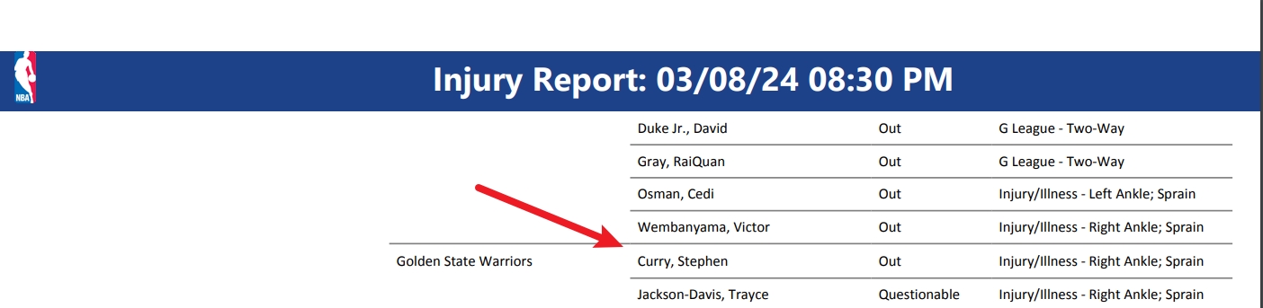 03月09日讯 勇士官方更新了伤病,库里确定缺席明日对马刺的比赛!