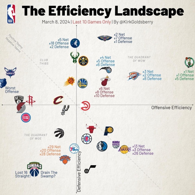 近10场攻防效率图:绿军火力独一档&攻防均前五 湖人进攻第三