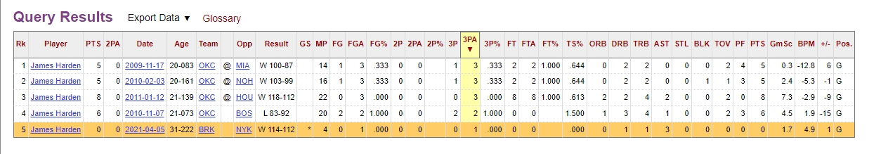 据统计,这是哈登生涯第6次两分球0出手,这也是哈登生涯首次在两分球0出手的情况下出手3个以上的三分球。