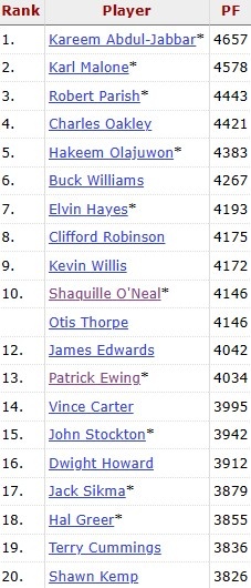 贾巴尔整个职业生涯合计送出了4657次个人犯规,高居历史第一,无任何现役球员接近。