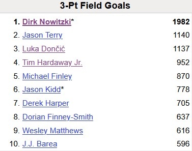 至此,他的生涯三分命中数超越“喷气机”特里(1140),排名独行侠队史第2名。排名第1的是诺维茨基的1982球。