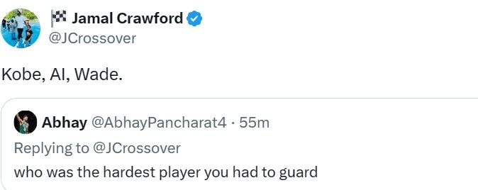 3月14日讯 今天,前NBA最佳第六人贾马尔-克劳福德开启在线问答。谈到谁是自己防过最难防的球员,克劳福德的答案是:“科比、艾弗森和韦德。”