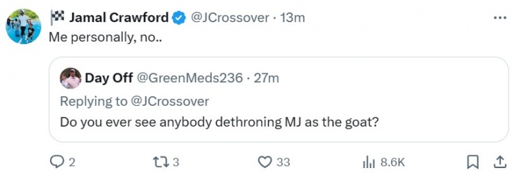 3月14日讯 今天,前NBA最佳第六人贾马尔-克劳福德开启在线问答。网友:“你曾见过有人能够取代迈克尔-乔丹成为历史最佳球员(GOAT)吗?”克六:“就我个人而言,没有见