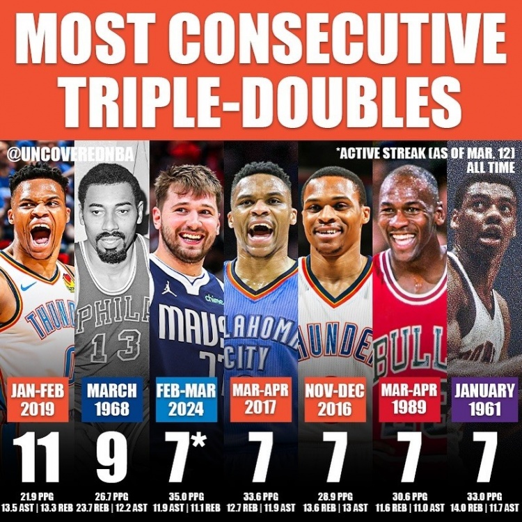 东契奇目前连续7场三双,与威少、乔丹和大O并列历史第三,仅次于威少和张伯伦;