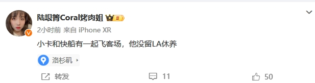 据莱昂纳德中方经纪人烤肉姐透露,小卡将和球队一起飞往客场,没留LA休养。
