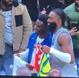 3月15日讯 NBA常规赛,凯尔特人在主场以127-112击败太阳。本场比赛,阿森纳球员萨卡现场观战,赛后他和杰伦-布朗交换了球衣。