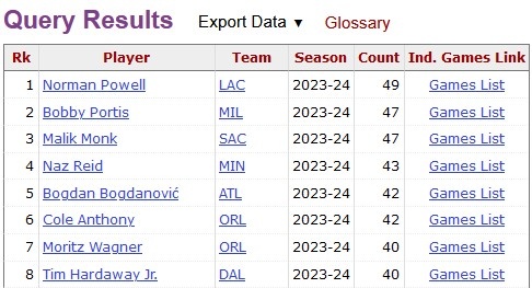 据统计,鲍威尔本赛季已50次替补得分上双,这一数据排名联盟第一。具体排名如下: