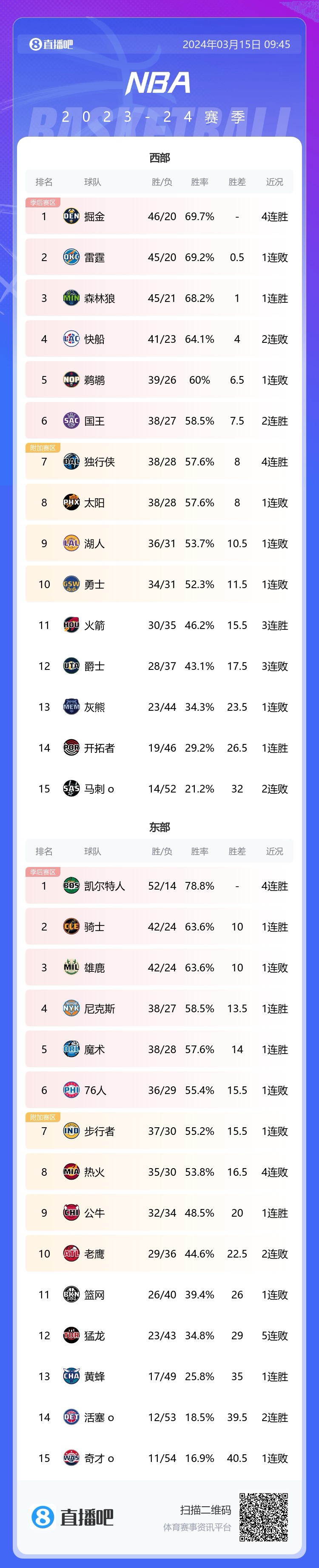 03月15日讯 今日NBA常规赛,太阳112-127不敌绿军。此役过后,太阳38胜28负跌至西部第八(战绩与独行侠相同,赛季交手太阳1-2独行侠),领先身后的湖人2.5场。