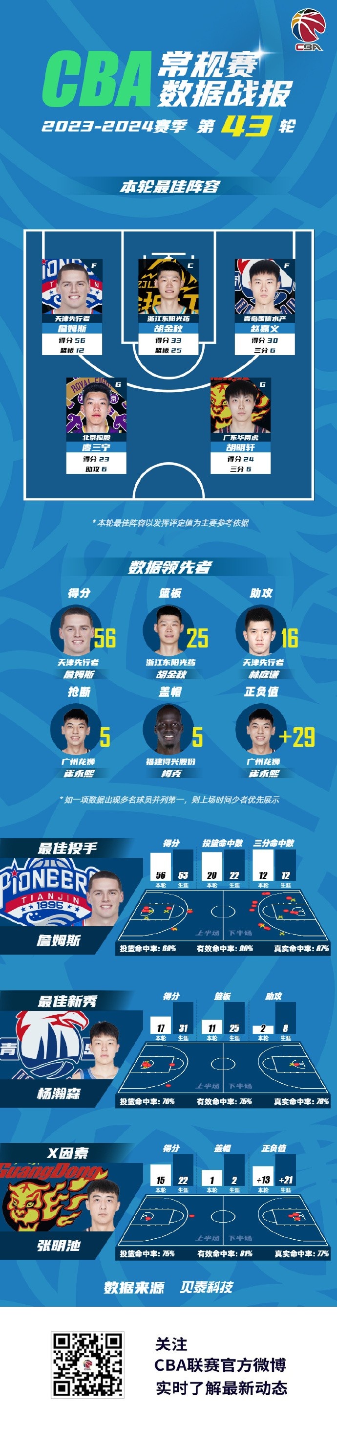 数据领先者方面:天津先行者球员詹姆斯以单场56分的数据领衔得分榜;