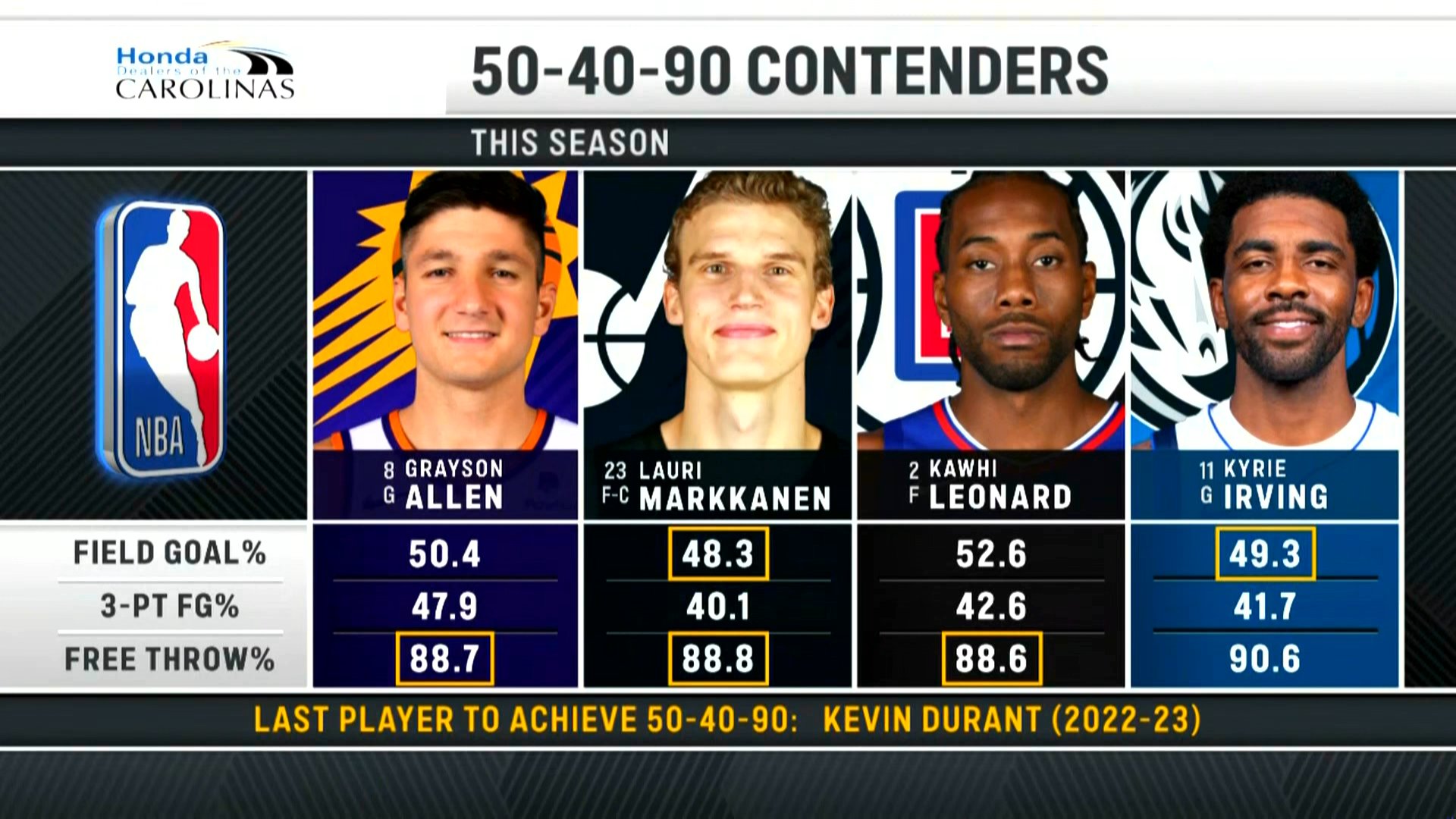 上一个180俱乐部(50%+40%+90%)的球员:杜兰特(2022-23赛季)