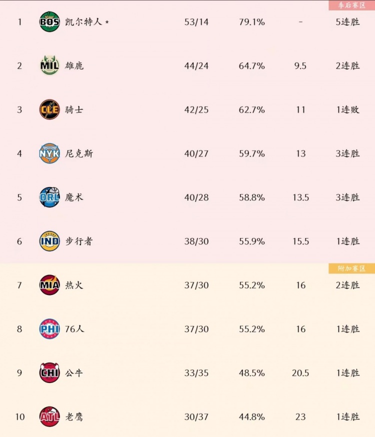 目前,76人战绩为37胜30负,排名东部第8位,而对手热火战绩同样是37胜30负,但后者因相互战绩更好,所以排在东部第7位。