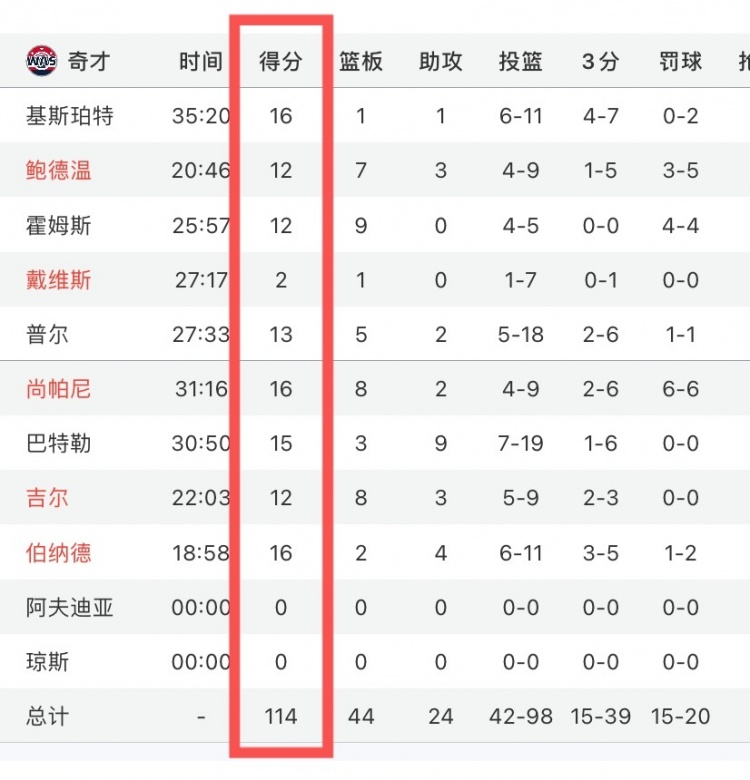 本场比赛,奇才共有八人得分上双,其中吉斯珀特、尚帕尼和伯纳德各16分、巴特勒15分、普尔13分、鲍德温、霍姆斯和吉尔各12分。