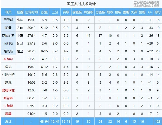 本场比赛,国王多点开花,12人有得分进账,6人得分上双,其中福克斯20分,蒙克17分,哈里森-巴恩斯16分,杜阿尔特14分,萨博尼斯13分,基根-穆雷10分。
