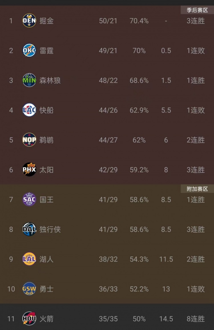 雷霆今日输球让出西部第一&掘金登顶 两队有0.5个胜场差