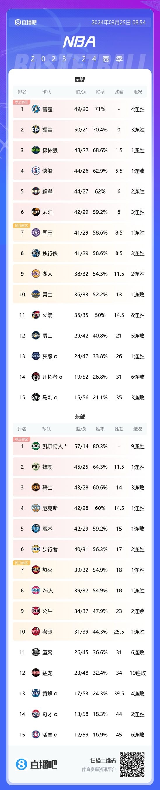 目前热火和76人均落后排名第6的步行者一个胜场。