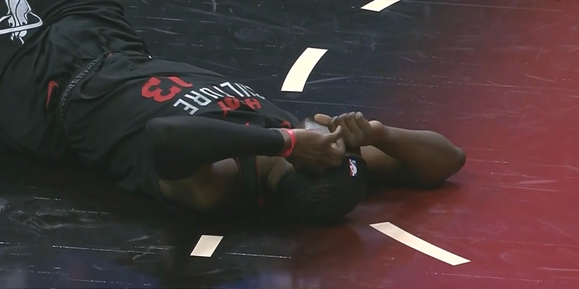 阿德巴约卡位时脑袋撞到穆迪肩膀 倒在地上好久才起来