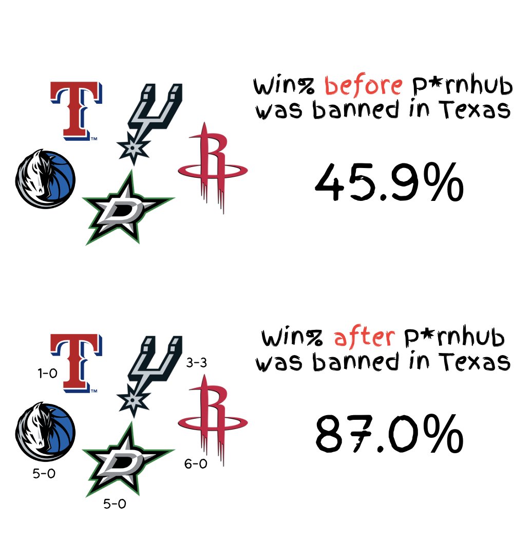 根据统计,在那之前的本赛季,得州的五大体育球队——火箭、独行侠、马刺、游骑兵(棒球)、星(冰球),合计的胜率是45.9%,而在Pornhub撤出之后,这五队的胜率几乎翻倍!达到了87.0%!