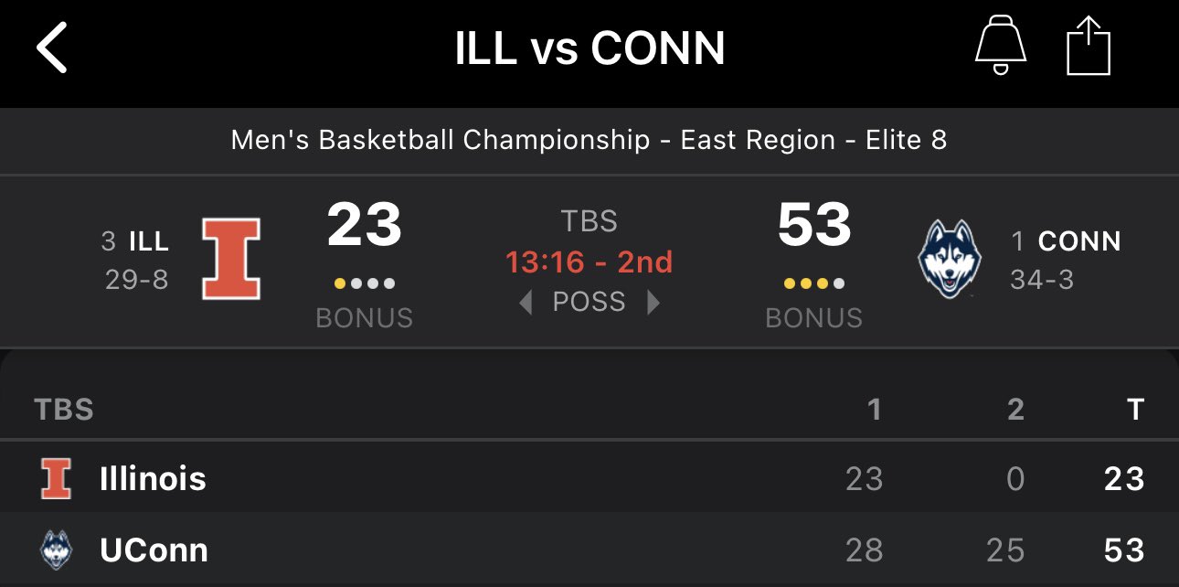 03月31日讯 NCAA精英八强赛,卫冕冠军康大vs伊利诺伊大学。