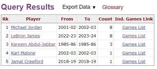 据统计,詹姆斯年满38岁已经9次砍下40+(包括常规赛+季后赛),超越乔丹(8次)排名历史第一,其他人合计有5次这种表现!