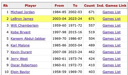 据统计,这是詹姆斯生涯(包括季后赛)第672次砍下30+,超越乔丹(671场),成为NBA历史上砍下30+场数最多的球员。