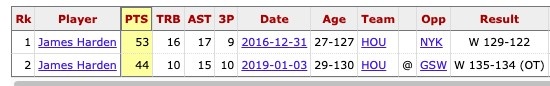 2019年1月4日,哈登对勇士拿下44分10篮板15助攻,进10个三分。