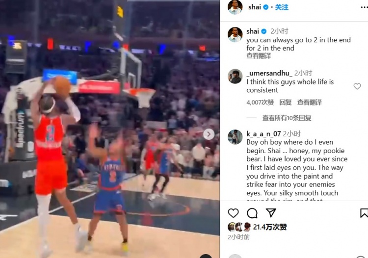 4月2日讯 今天,雷霆球星亚历山大晒出了昨天准绝杀尼克斯的视频,并写道:“在最后关头,你永远可以相信2号能够得2分。”