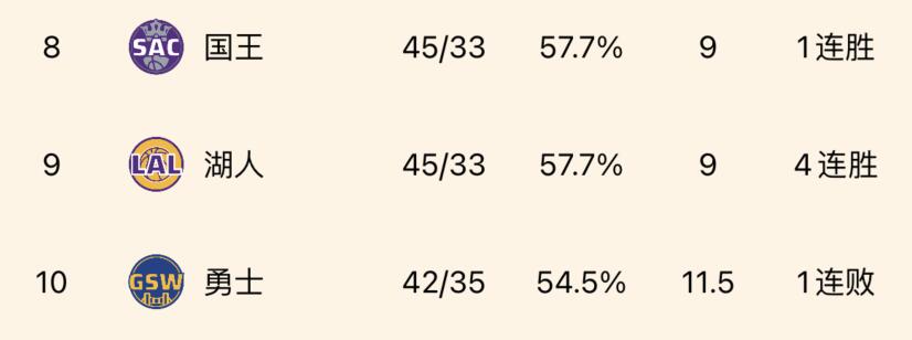 赢下本场后,国王战绩来到45胜33负平湖人,凭借交手优势(对阵湖人4-0),排在西部第8,湖人掉至西部第9。