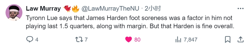 赛后,泰伦-卢解释了哈登的上场情况,他表示,哈登的右脚酸痛是他最后没有上场的原因之一,另一个原因是当时双方的分差。