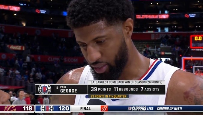 本场比赛,乔治继续承担起球队得分重任,在球队大比分落后时也没有放弃,在末节站出来发力爆砍23分,并最终命中准绝杀中投,还大帽加兰的绝平上篮,帮助球队逆转获胜。