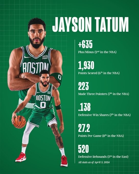 4月8日讯 今日绿军官方晒出球队核心塔图姆本赛季至今表现,具体如下:正负值+635、联盟第2;总得分1930分、联盟第6;命中223记三分、联盟第7;防守胜利贡献值.138、