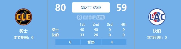 4月8日讯 NBA常规赛,快船主场迎战骑士。上半场,快船防守端表现极差,客场背靠背的骑士万箭齐发,半场轰下80分,半场打完快船59-80落后21分。