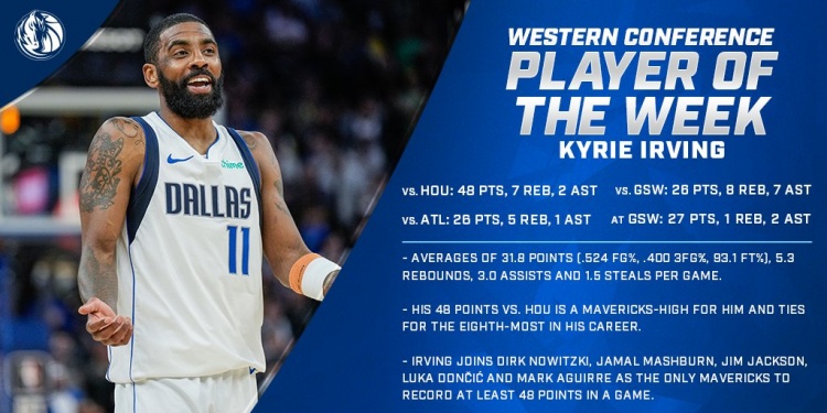 4月9日讯 NBA官方今日公布了上周周最佳球员得主,欧文(西部)与波尔津吉斯(东部)分别当选。
