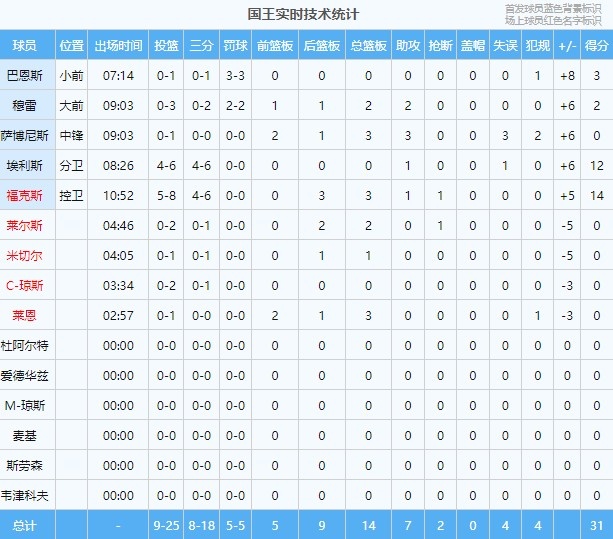 第一节,国王主攻外线,全队三分18投8中,命中率44.4%。福克斯和埃利斯各中4记三分。