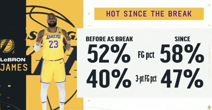全明星前詹姆斯命中率52%三分命中率40% 之后提升至58%及47%
