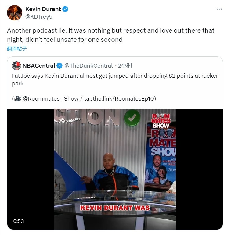 杜兰特转发并写道:“又一个播客谎言,那天晚上,那里只有尊重和爱,没有一秒钟感到不安全。”