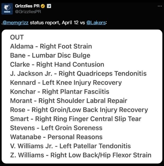4月13日讯 今早8点,灰熊将在主场迎战湖人,灰熊官方此前公布了本场比赛的伤病报告,其中有13名主要轮换人员均因伤缺席。