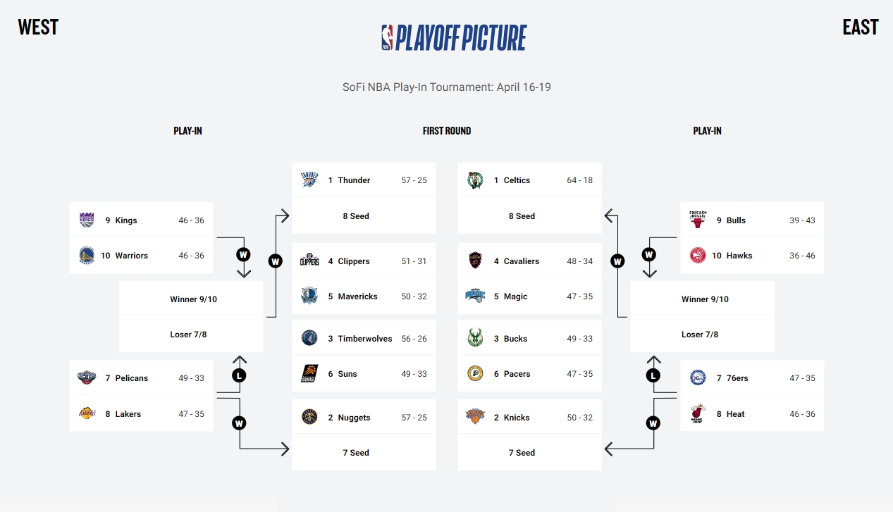 西部:季后赛森林狼(3)VS太阳(6)快船(4)VS独行侠(5)附加赛鹈鹕(7)VS湖人(8)国王(9)VS勇士(10)东部:季后赛雄鹿(3)VS步行者(6)骑士(4)VS魔术(5)附加赛76人(7)VS热火(8)公牛(9)VS老鹰(10)